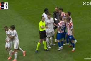 體育資訊09月28日訊 馬競vs皇馬最后時刻爆發(fā)沖突,馬斯坦托諾被拉開,慢鏡頭給到,馬斯坦托諾一腳爆射場邊。