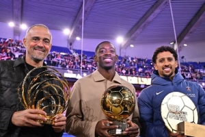 巴黎曬恩里克、登貝萊、馬爾基尼奧斯+三獎項合影:集體的力量