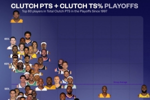 體育資訊9月29日訊 近日,數據媒體NBA University總結了自從1997年以來(NBA官網該項數據統計起始時間)在NBA季后賽中關鍵得分前60球員的真實命中率分布圖表。