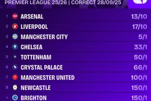 體育資訊09月29日訊 本輪英超,阿森納2-1逆轉絕殺紐卡斯爾聯,賽后有關機構更新了英超冠軍的賠率。