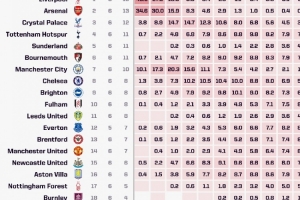 本賽季英超奪冠概率(目前積分榜排名)
