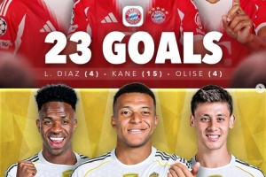本賽季五大聯賽進球最多三人組:拜仁3將23球居首,皇馬16球次席