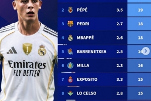 本賽季西甲創造機會榜:居勒爾21次居首,佩德里、姆巴佩在列