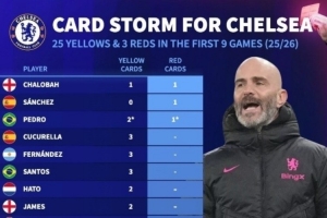 體育資訊10月1日訊 德國轉會市場統(tǒng)計,切爾西新賽季前9場比賽,領到25張黃牌和3張紅牌。