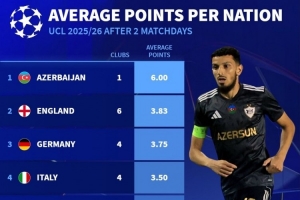 歐冠各國球隊平均積分:阿塞拜疆6分最高,英格蘭、德國二三位