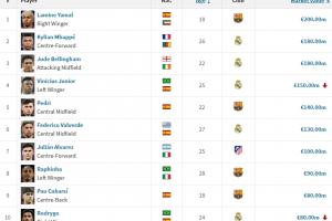 體育資訊10月02日訊 德轉今天發布了最新一期西甲身價更新,西甲前十身價也迎來些微的變化,最新西甲身價前十如下: