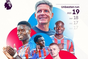 據英超官方統計,水晶宮各賽事19場不敗,創造隊史最長不敗紀錄。