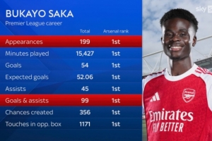 薩卡英超首秀以來出戰199場、進54球、助攻45次,阿森納隊內居首
