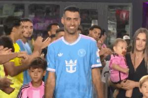 美職聯(lián)邁阿密4-1新英格蘭革命賽后,布斯克茨帶著妻子和三個(gè)孩子參加退役儀式。