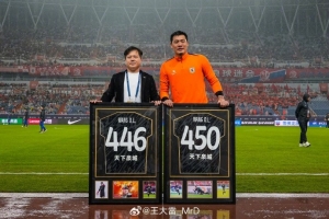 7月27日山東泰山對陣梅州客家的比賽,王大雷首發出戰,他也以446場成為中國頂級聯賽出場王。在昨天泰山對陣玉昆賽前,王大雷領取了446場的紀念球衣,他同時還領取了中國頂級聯賽450次出場紀念球衣。